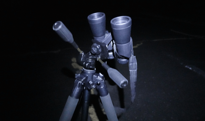 そこで今回は、双眼鏡に三脚取付ホルダーを取り付けて使用してみました。ホルダーを使うことで、一般的なカメラ用三脚に固定でき、視界が安定します。実際に試してみると、星の像が落ち着き、光の広がりや淡い天体も比較的観察しやすく感じられました。