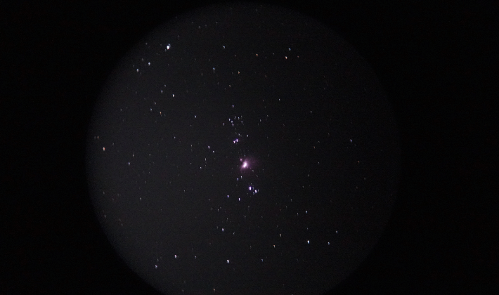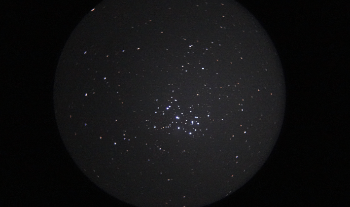 肉眼では6〜7個ほどの星しか見えませんが、双眼鏡を使うと多くの星が視野いっぱいに広がります。星団全体がひとまとまりとして見え、とても印象的でした。
