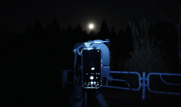 試しにスマホホルダーを使って月を撮影してみました。双眼鏡の接眼レンズとスマホのカメラを固定できるため、手ブレが抑えられ、クレーターの様子も比較的はっきり写りました。