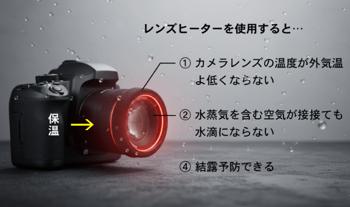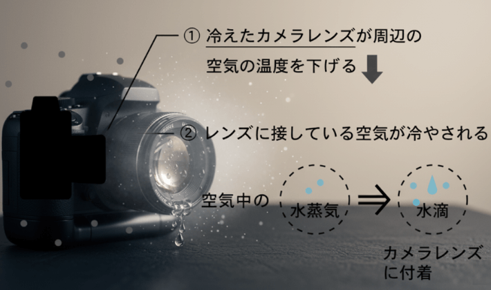 カメラレンズの結露は、天体撮影で避けて通れない問題です。原因は「温度差」と「湿度」。暖かい空気に含まれる水蒸気が、冷えたレンズ表面に触れると水滴に変わり、レンズを曇らせてしまいます。