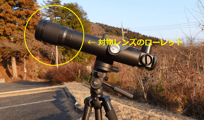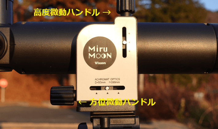 月を中央に寄せるときは、鏡筒についている微動ハンドルを使います。少しずつ動かせるため、狙った位置に正確に合わせられます。