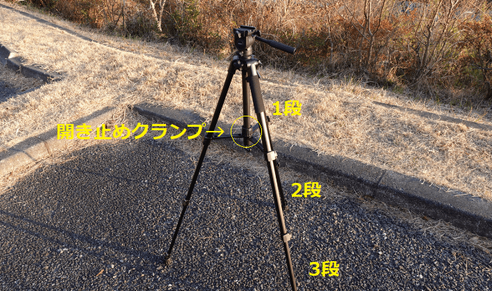 三脚の脚は4段階に伸ばせますので、見やすい高さに調整できます。小さなお子さんが使う場合は、脚を3段ほど伸ばすとちょうどよい高さになります。脚を広げたら、開き止めクランプをしっかり固定します。