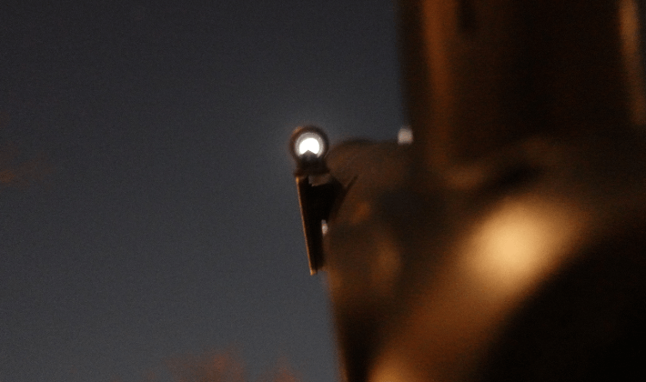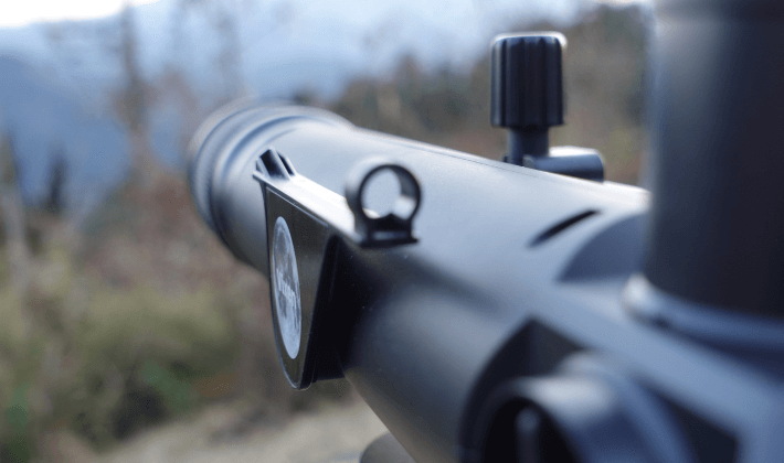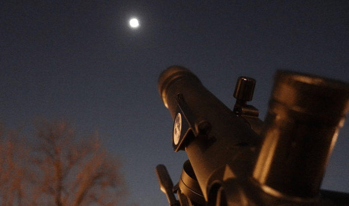 望遠鏡の側面にある素通しファインダーをのぞき、月が中央に来るように向きを合わせます。ファインダーは広い範囲を見渡せるので、まずはここで大まかに位置をつかみます。