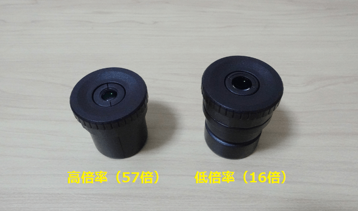 付属の接眼レンズは2種類。ワンタッチ倍率変更接眼レンズはノブを回すと、低倍率(16倍)と高倍率(57倍)にワンタッチで変更できます。