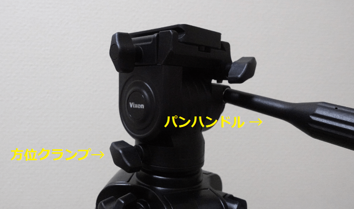 三脚のパンハンドルと方位クランプをゆるめて、望遠鏡を月の方向にざっくり向けます。月が見える位置に合わせたら、パンハンドルと方位クランプを締めて固定します。