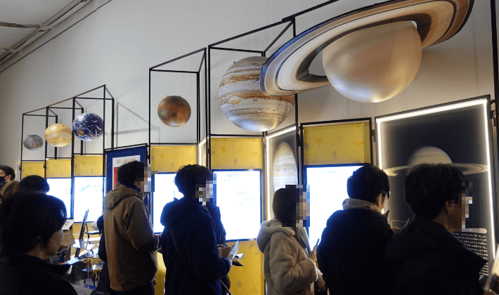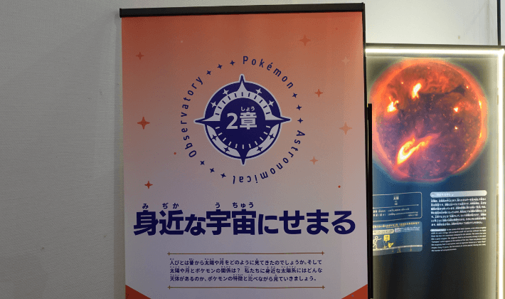 「エリア2:身近な宇宙にせまる」は、展示の第二章として、太陽や月、太陽系の惑星を、ポケモンと一緒に楽しく学べます。惑星の特徴は、性質や見た目が似ているポケモンと並べて紹介されており、感覚的に理解できるよう工夫がされています。子どもから大人まで、楽しく学べる内容になっています。