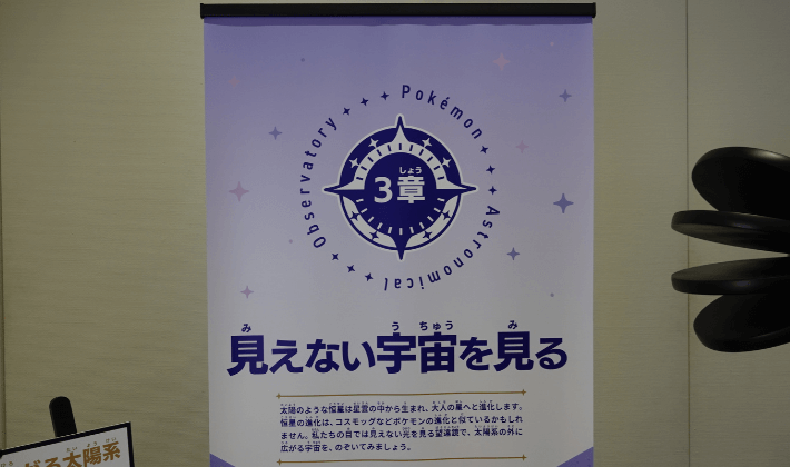 「エリア3:見えない宇宙を観る」では、人の目には見えない宇宙の姿に注目しています。電波・赤外線・X線などを使えば、ブラックホールや星が生まれる様子など、ふだん見えない宇宙の秘密がわかります。このエリアでは、天文台や望遠鏡がどのようにして「見えない光」をキャッチし、宇宙を調べているのかを、ポケモンと一緒に学ぶことができます。