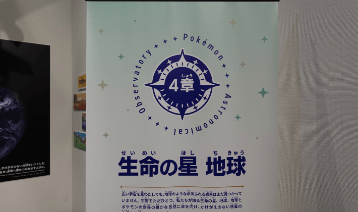 「ポケモン天文台 エリア4:地球・生命の星」は、地球がどのようにして生命を育む惑星になったのかを、ポケモン世界を通して学べるエリアです。水や自然に関わるポケモンたちを通して、地球が命あふれる星であることをあらためて感じられる展示となっています。