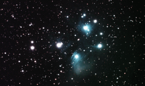 アルデバランから、さらに同じ方向(右上)に少し視線を移します。青白い星がぎゅっと集まって見える星の集まりががあります。それがプレアデス星団(すばる)です。肉眼では小さな北斗七星のような形、またはぼんやりとした光のかたまりのように見えると思います。