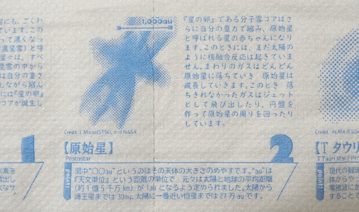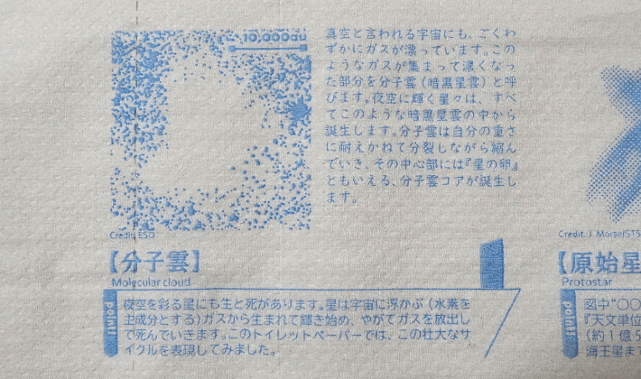 紙質は非常に柔らかいシングルタイプで、普段使用しているトイレットペーパーと変わらない使い心地を実現。実用性と、星の一生を読む楽しさを両立。