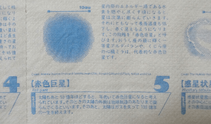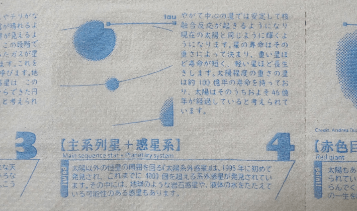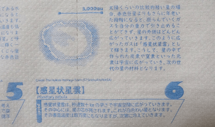 標準的な星の一生(約100億年)を全6項目でに分けて解説。天文情報がトイレットペーパーの表面に印刷された、遊び心あふれる学習系グッズ。
