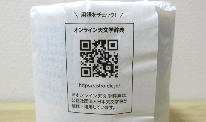 このトイレットペーパーは、天文学への理解を深めるためのサポートとして、「オンライン天文学辞典」へのQRコードとURLを提供しています。これは、解説に出てくる専門用語をすぐに調べられるように工夫されたサービスです。公益社団法人日本天文学会が監修・運用しているため、信頼性の高い情報を参照でき、学習を深めるのに役立ちます。